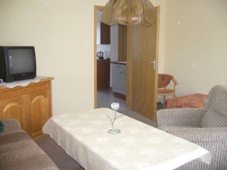 Die Wohnung besteht aus zwei Zimmern (ca. 35qm) - einer Küche, Wohnzimmer mit Couch sowie einer modernen Schlafliege und einem kleinen Schlafzimmer mit zwei Einzelbetten. Die Wohnung verfügt über ein Bad mit Dusche. Die Wohnung befindet sich in der ersten Etage.